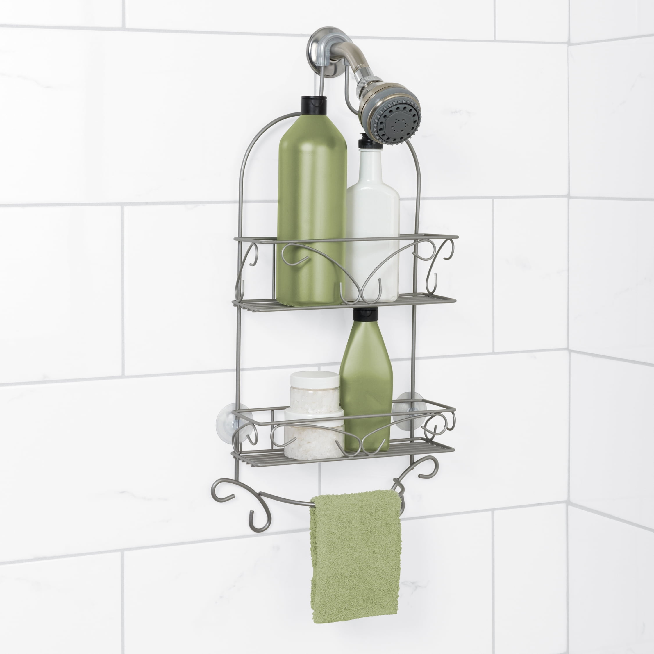 Satin Nickel Shower Caddy with 2 Shelves, Zenna Home Scroll over-the-Showerhead
