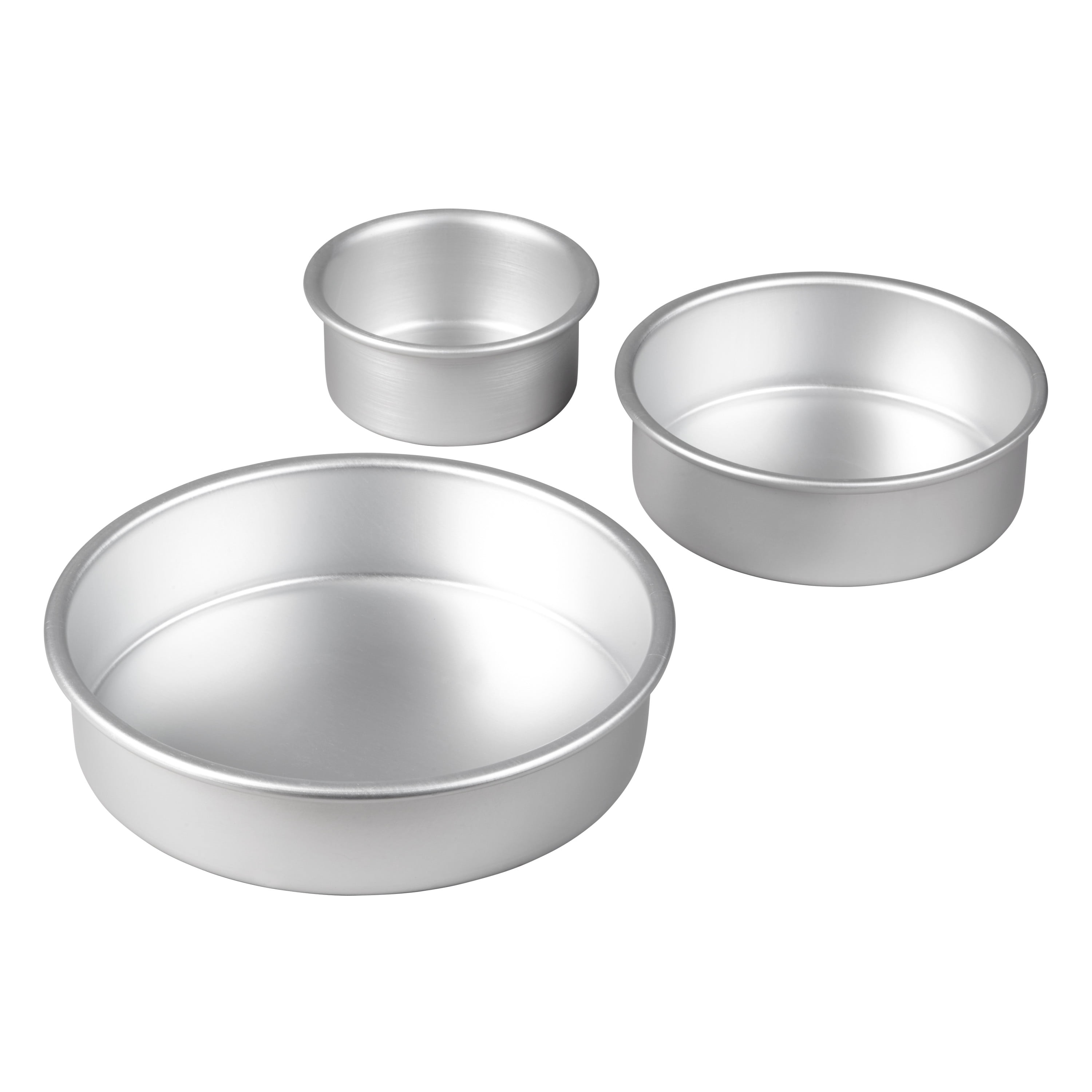 You can bake a complete tiered cake all at once with this round cake pan set. Bake your way to the perfect birthday, anniversary or wedding cake with this 3-piece round pan set. Made with premium aluminum for even heating, the sides are deeper so you get higher cakes that are perfect for layering and decorating. Not safe for use with metal tools.