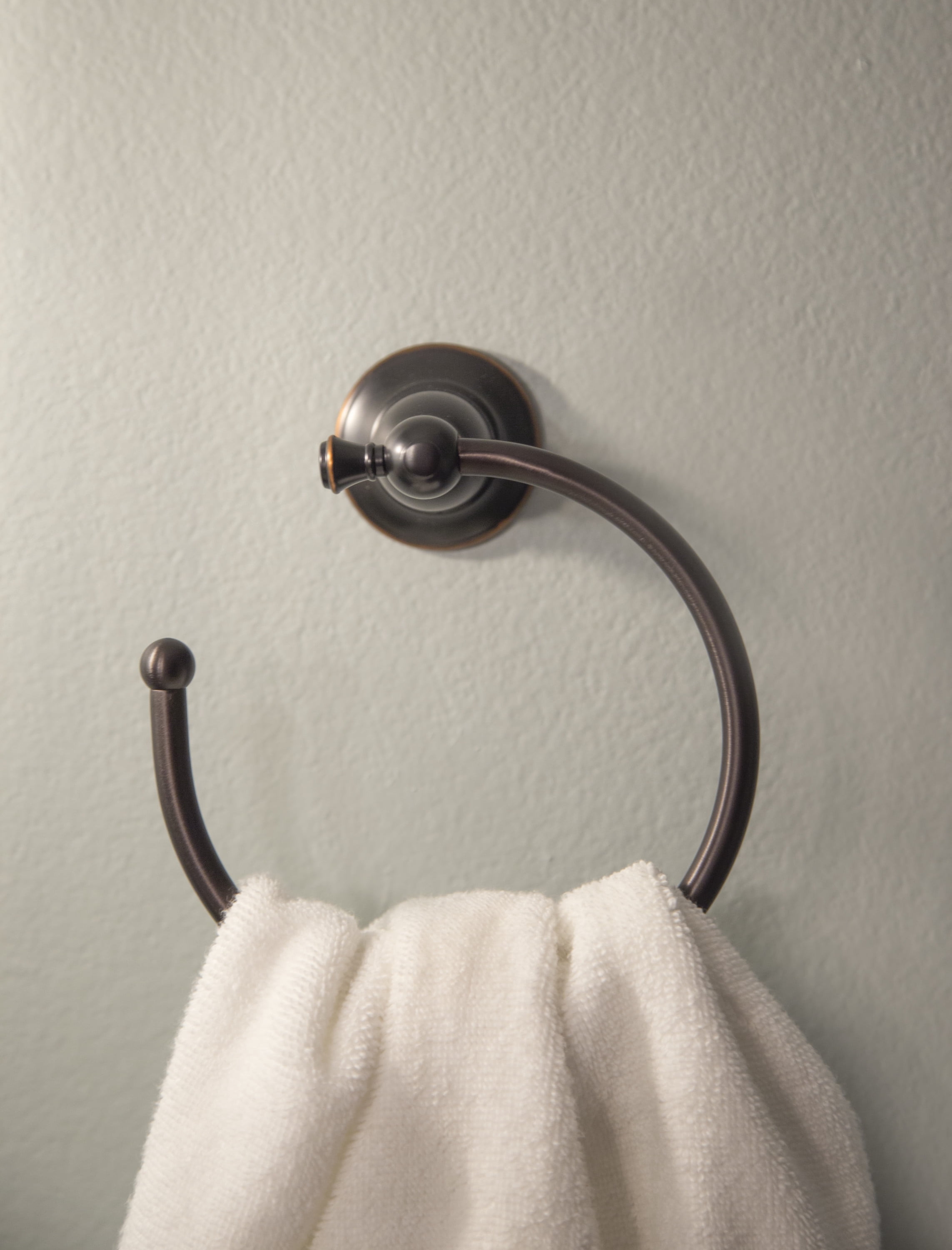 Features: Classic style towel ring with an Oil Rubbed Bronze finish, perfect for bathroom and kitchen spaces, Dimensions: 6.9 in. H x 6 in. W; Extends 2.9 in. from wall, Accessory comes with easy to install instructions and EZ anchor mounts, Metal construction for reliable, long-lasting durability, Coordinate the Oakmont Collection with matching towel bars, toilet paper holder and robe hook, 1-Year limited warranty