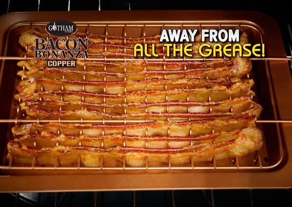 As Seen on TV – Everyone loves crispy delicious bacon but cooking in all that grease can lead to too much cholesterol, fat and a whopping number of calories! Gotham Steel has done it again- introducing Bacon Bonanza! The healthy, fast and easy way to make crispy delicious bacon right in your oven. This little gold mine can line up 12 bacon strips. The rack spaces the bacon evenly so as it cooks the fat drips away. And the pan catches all the grease so cleaning up is a breeze. So, your bacon will come out perfect every time giving you less calories, less fat, less cholesterol. Now that’s healthy! And like all our Gotham Steel products, the Bacon Bonanza has non-stick technology, so your bacon slips right off. The tray can also double up us a baking pan. Your Bacon Bonanza can be used to make great tasting thin sliced turkey bacon, tofu bacon and even thick-sliced country style bacon.