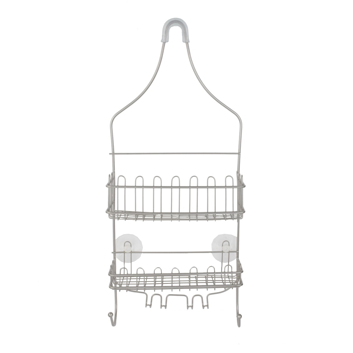 Store and organize your shower essentials in this Home Basics Satin Nickel Shower Caddy. Made from heavyweight bronze-plated steel, it offers durable use. This bath shower caddy features a rust-resistant and anti-slip design. It keeps your shampoo, conditioner and soap all in one convenient and easy-to-reach place. This shower storage caddy also features hooks for razors and other accessories. It offers a smart choice for people looking to keep things neat and tidy.