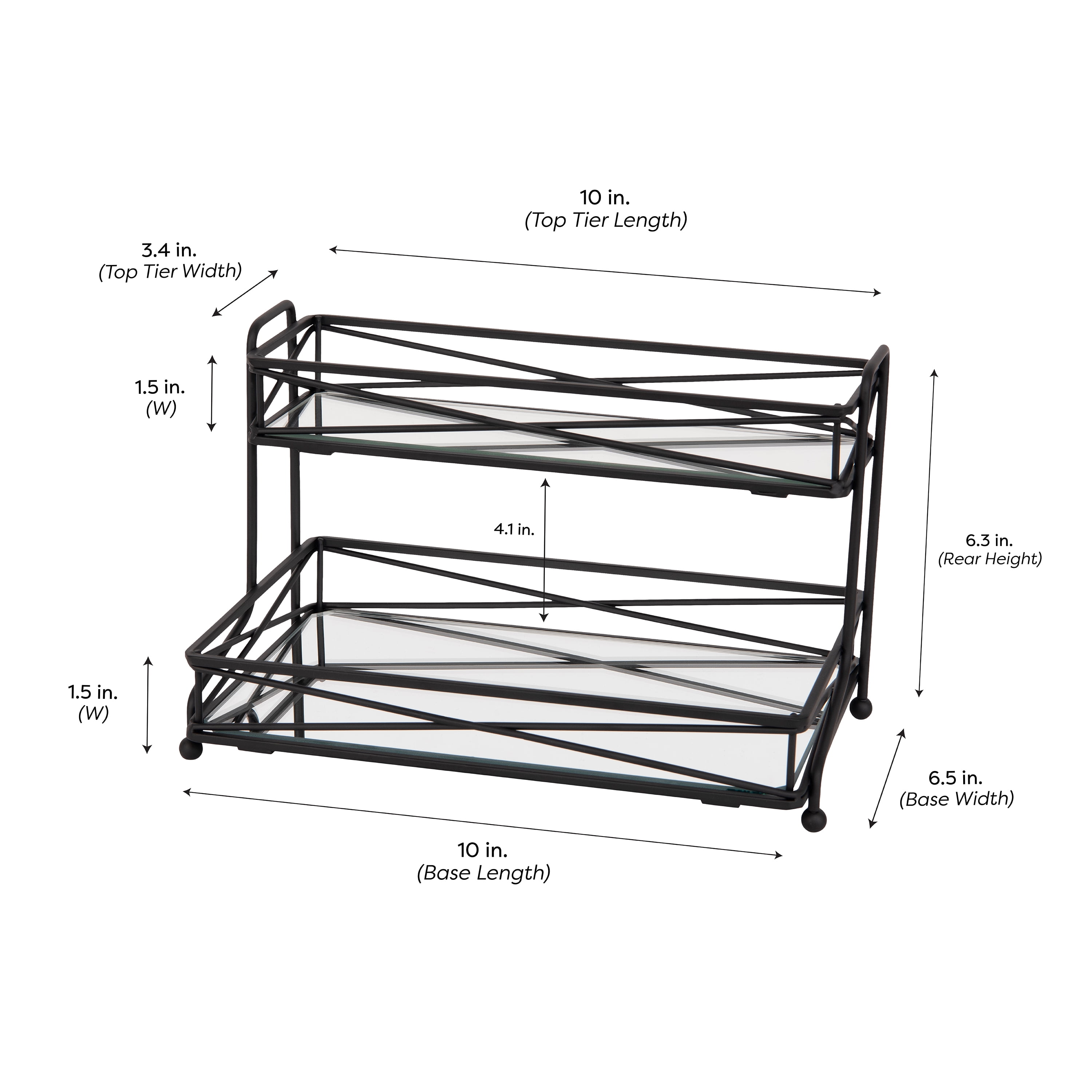 Add a touch of sophistication to your bathroom or vanity décor with the Home Details 2 Shelf Tier Vanity Tower in Matte Black. The 2 tier intricate design and mirrored bottom adds an elegant touch to your room. Perfect for displaying your perfumes, make up and toiletries. The 2 tier design creates more space on your countertop and keeps it organized. The matte black finish gives it a sleek style to fit in with any home decor!