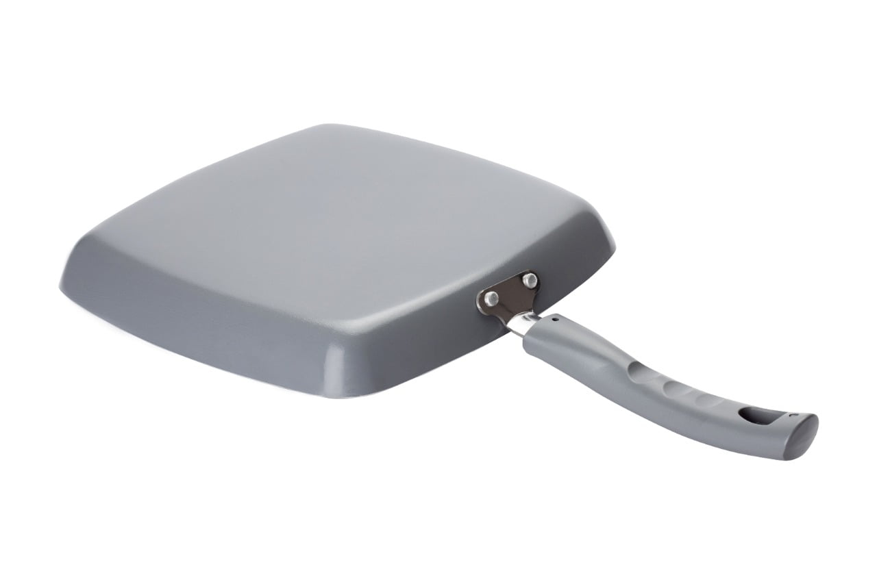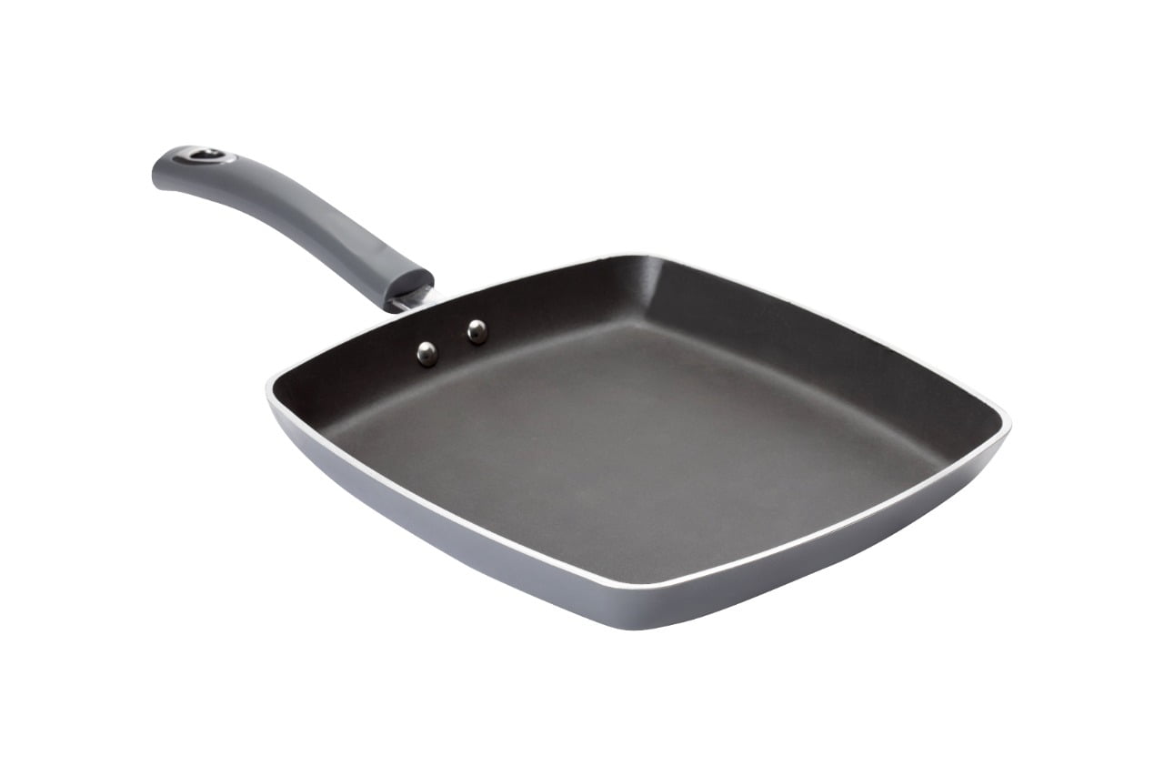 Mainstays Heavy Weight 11 inch Non-Stick Aluminum Square Griddle. Easy cleanup & Release and is Dishwasher Safe. Thick Construction ensures Heat Retention and Even Distribution of Heat. Soft Anti-Slip Handle gives a Firm Grip. Grey Finish coordinates Well with Your Existing Kitchenware.