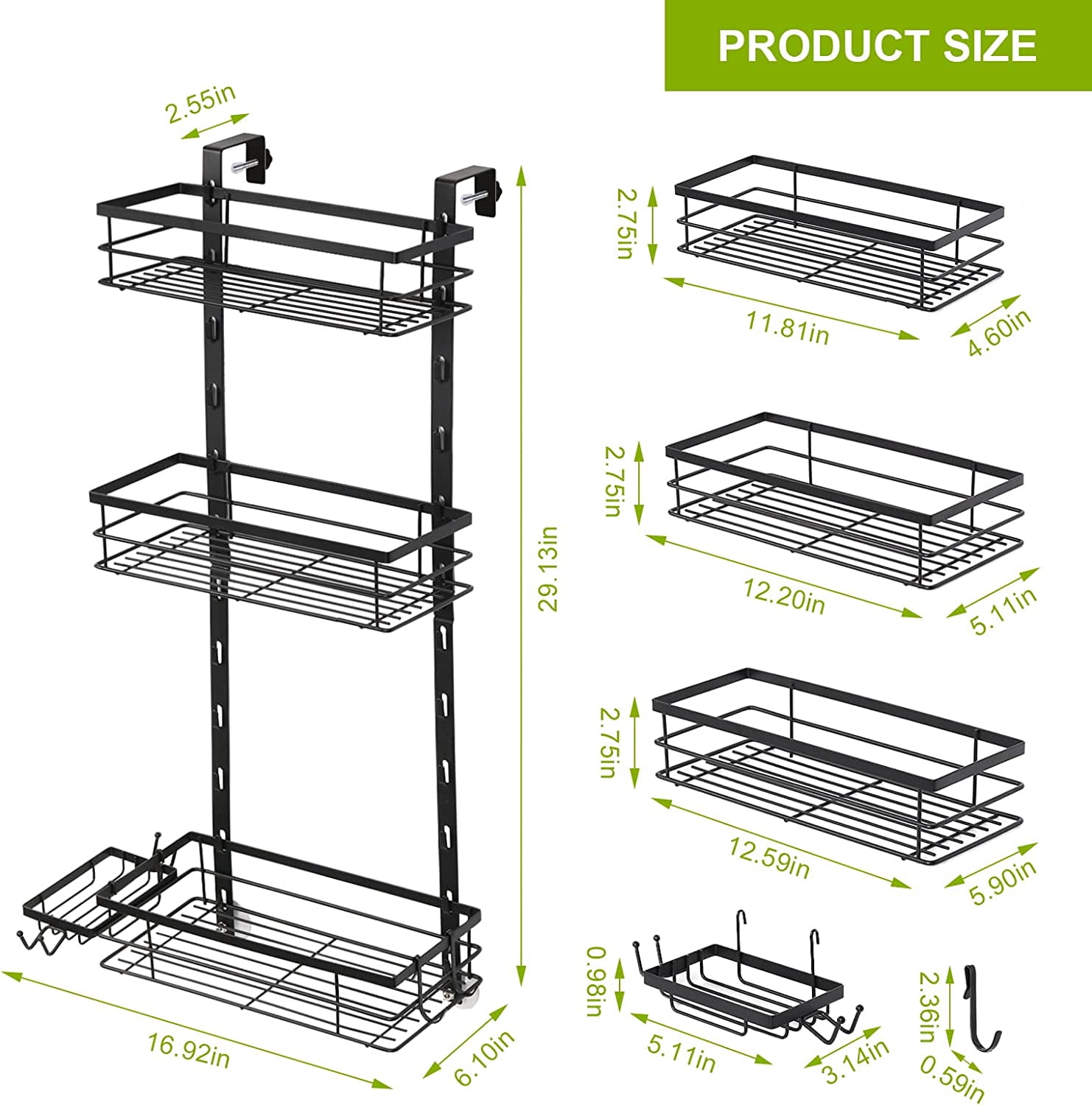 • [Adjustable Height Shower Caddy]: This adjustable back door bathroom rack is a behind door shower rack with 3 large capacity adjustable height shelves, you can adjust the layers and levels according to your needs distance between them to accommodate different sized items such as daily necessities, face creams, etc., while still having enough room for the tallest shampoo and conditioner bottles.