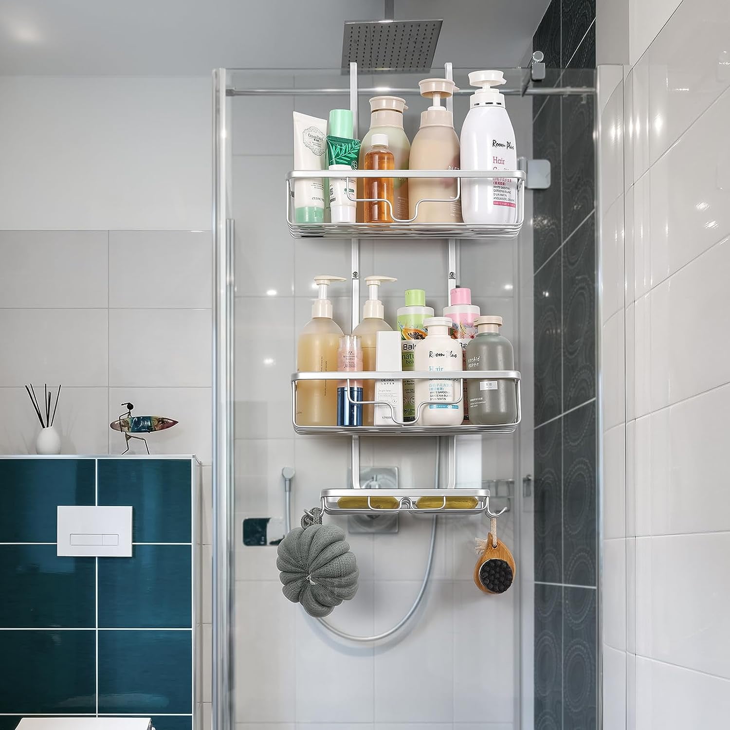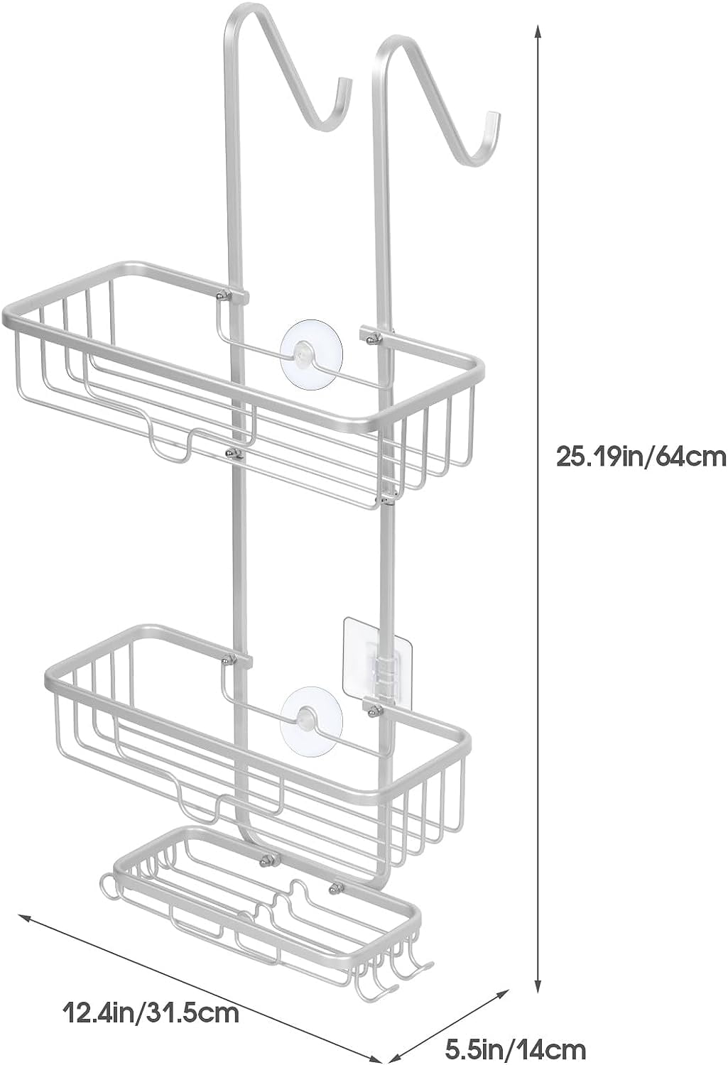 There are two over the door hooks, which you can hang your bath accessories like towels, bathrobes, razors and more. The Over the door shower caddy has suction cups and screws to hold it in place, it is tightly attached to the shower wall. You can put 2 different sizes of soap on the soap holder, each soap holder has 2 solid hooks for hanging bath ball, razors, or brushes. The shower caddy is a flexible and versatile shower caddy that organizes your shower space while providing tons of storage room for all of your shower essentials.